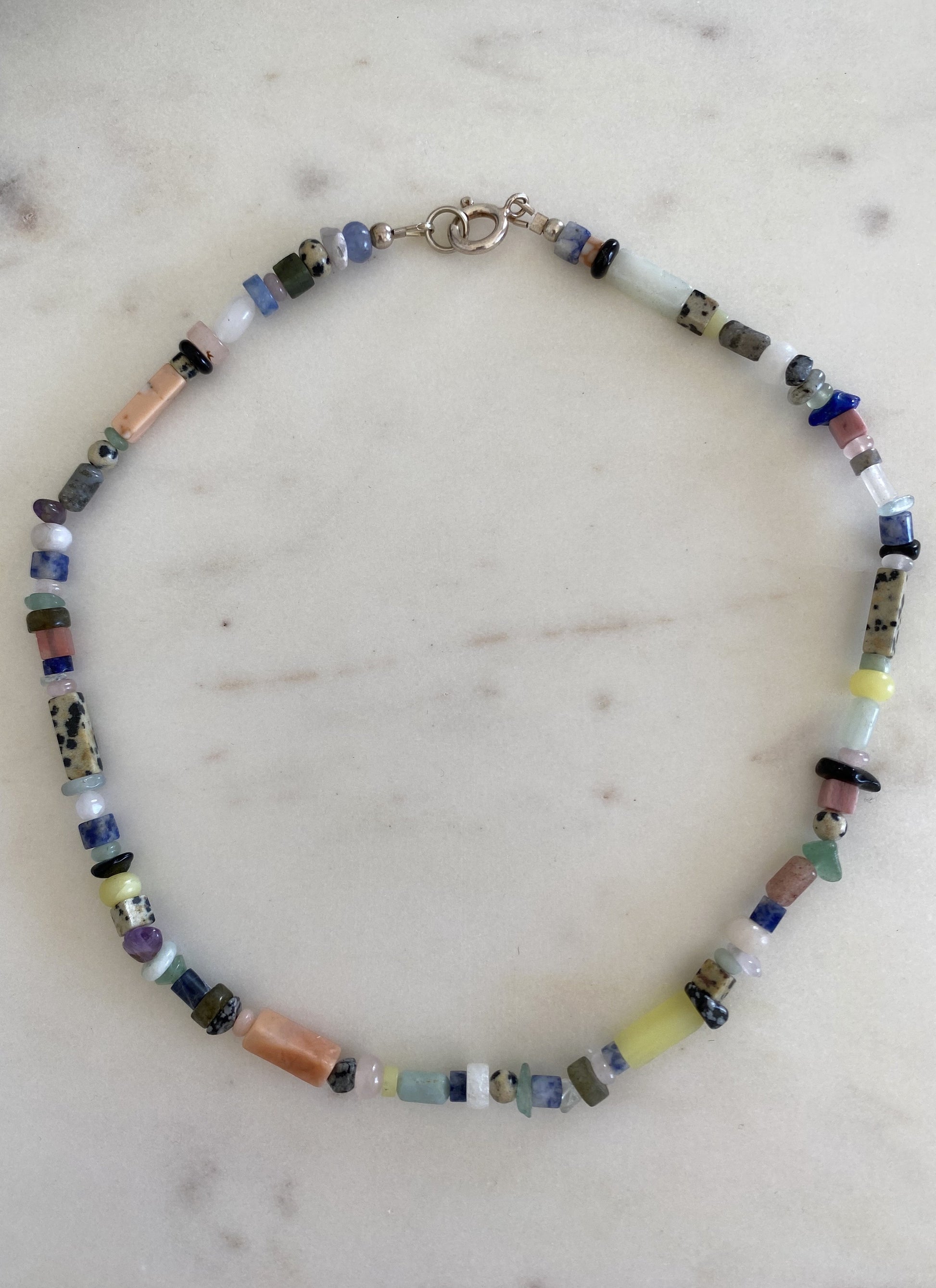 Inspired by the incredible landscape of Southern Spain, the beautiful stones of Seraphinit, Sodalite, Dalmatian Jasper, and Rose Quartz reflect the endless summer days at the beach.